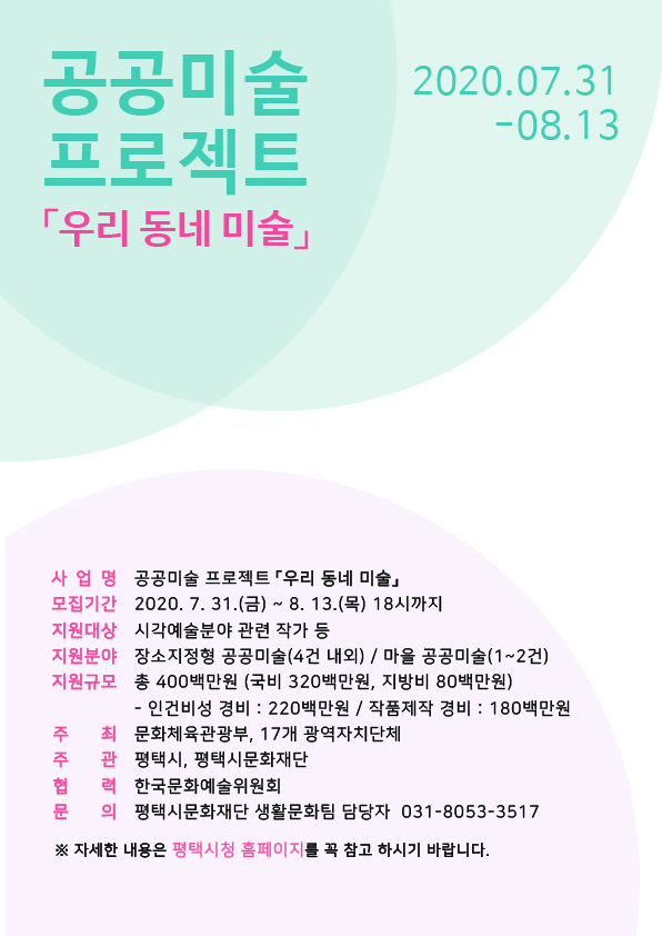 À̹ø ÇÁ·ÎÁ§Æ®´Â ÆòÅýÃÀÇ Áö¿ª ÀÚ¿ø°ú ½ºÅ丮¸¦ ¹Ý¿µÇÏ¿©, ¢ºÀå¼ÒÁöÁ¤Çü °ø°ø¹Ì¼ú(½ÅÀ嵿 ¹Ì±ºÃ¶µµº¯, 4~5ÆÀ ³»¿Ü, ÆÀ´ç ¾à 7,500¸¸¿ø) ¢º¸¶À» °ø°ø¹Ì¼ú(°ü³» ¸¶À» 1°³¼Ò ÀÚÀ¯ ¼±ÅÃ, 1~2ÆÀ, ÃÑ 1¾ï¿ø) 2°³ ºÐ¾ß·Î ½ÅûÀ» ¹Þ´Â´Ù.