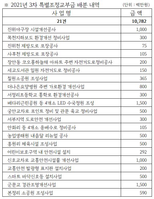 À̹ø¿¡ È®º¸ÇÑ Æ¯º°Á¶Á¤±³ºÎ±ÝÀº ÁøÀ§¾ß±¸Àå ½Ã¼³°³¼± °ø»ç 10¾ï¿ø µî ÃÑ 21°ÇÀÇ ÁÖ¿äÇö¾È »ç¾÷¿¡ ¾²ÀÏ ¿¹Á¤ÀÌ´Ù.