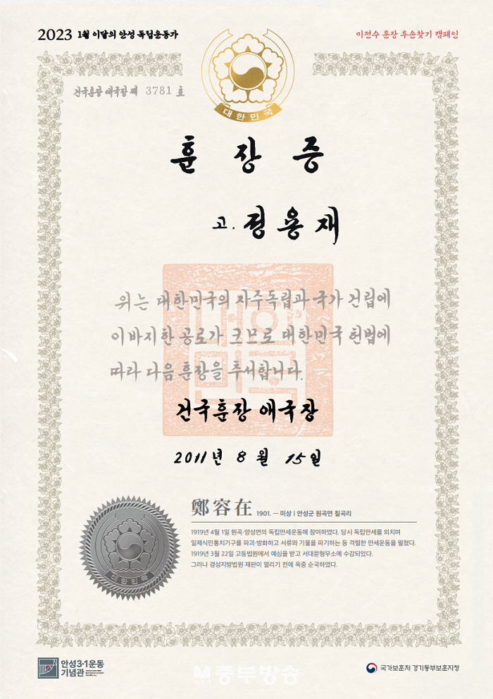 ¾È¼º½Ã¿Í °æ±âµ¿ºÎº¸ÈÆÁöûÀÌ °øµ¿À¸·Î 2023³â 1¿ù ÀÌ´ÞÀÇ ¾È¼º µ¶¸³¿îµ¿°¡·Î Á¤¿ëÀç(ï÷é»î¤, 1901~¹Ì»ó) ¼±»ýÀ» ¼±Á¤Çß´Ù.