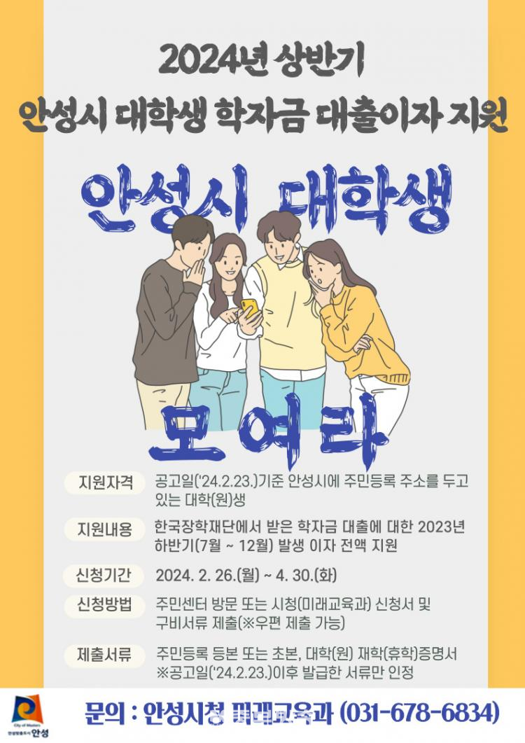 Áö¿ø ´ë»óÀº °ø°íÀÏ(2024. 2. 23.)±âÁØ ¾È¼º½Ã¿¡ Áֹεî·Ï ÁÖ¼Ò¸¦ µÎ°í ÀçÇÐ(ÈÞÇÐ Æ÷ÇÔ)ÁßÀÎ ´ëÇÐ(¿ø) ÀçÇлý(ÈÞÇлý)ÀÌ´Ù.