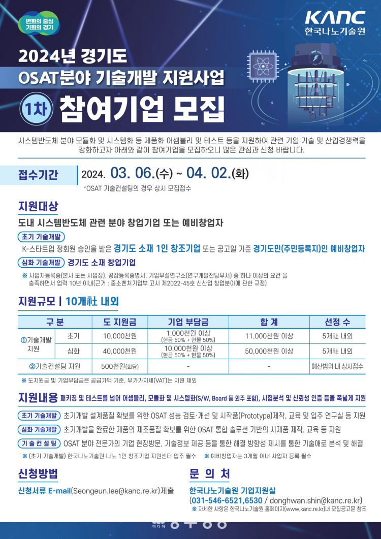 °ø¸ð ¼±Á¤ °á°ú´Â Àü¹®°¡ Æò°¡¸¦ °ÅÃÄ 4¿ù ÃÊ¿¡ ÃÖÁ¾ °áÁ¤µÈ´Ù. °ø¸ð ½Åû ¹æ¹ýÀº »ç¾÷°èȹ¼¿Í ±¸ºñ¼·ù¸¦ °®Ãç ÀüÀÚ¸ÞÀÏ(Ãʱâ Áö¿ø:031-546-6530, seongeun.lee@kanc.re.kr / ½ÉÈ Áö¿ø ¹× ±â¼úÄÁ¼³ÆÃ:031-546-6521, donghwan.shin@kanc.re.kr)·Î ½ÅûÇÏ¸é µÇ¸ç, ÀÚ¼¼ÇÑ ³»¿ëÀº °æ±âµµÃ» ´©¸®Áý(gg.go.kr) ¹× Çѱ¹³ª³ë±â¼ú¿ø ´©¸®Áý(www.kanc.re.kr)À» ÅëÇØ È®ÀÎÇÒ ¼ö ÀÖ´Ù.