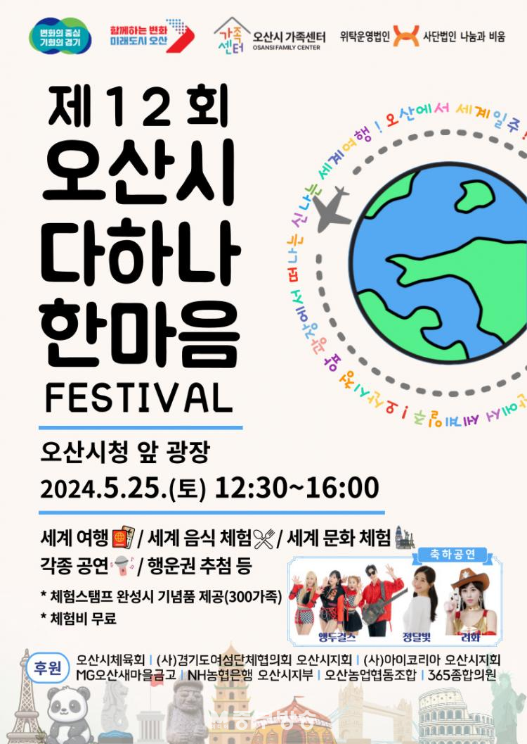 À̹ø ÃàÁ¦´Â ¿À»ê½Ã Áö¿ª»çȸ ³» ´Ù¾çÇÑ °¡Á·ÀÌ Çϳª°¡ µÇ±â À§ÇØ ¡®¿À»ê¿¡¼ ¼¼°èÀÏÁÖ¡¯¸¦ ÁÖÁ¦·Î ¼¼°è ¿©Çà, ¼¼°è À½½Ä üÇè, ¼¼°è ¹®È üÇè µî ´Ù¾çÇÑ Ã¼Çè ºÎ½º°¡ ¿î¿µµÈ´Ù.