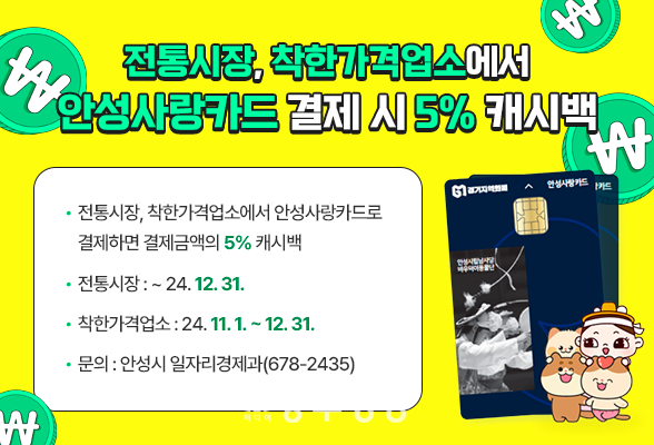 À̹ø À̺¥Æ®´Â ±âÁ¸ Àμ¾Æ¼ºê 7%¿Í´Â º°°³·Î ÀüÅë½ÃÀå, ÂøÇѰ¡°Ý¾÷¼Ò¿¡ ÇØ´çµÇ´Â °÷¿¡¼ ¾È¼º»ç¶ûÄ«µå »ç¿ë ½Ã °áÁ¦ ±Ý¾×ÀÇ 5%°¡ ij½Ã¹é ÇüÅ·ΠÁö±ÞµÇ¸ç, ÃÖ´ë 12% ÇÒÀιÞÀ» ¼ö ÀÖ´Ù.