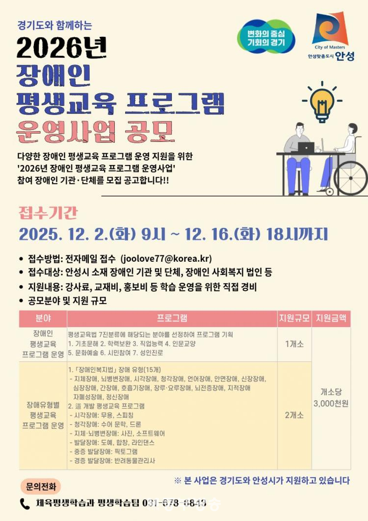 °æ±âµµ¿Í ¾È¼º½Ã°¡ Áö¿øÇÏ´Â À̹ø »ç¾÷Àº ¼ºÀÎ Àå¾ÖÀο¡°Ô ¸ÂÃãÇü ±³À°À» Á¦°øÇØ Â÷º° ¾ø´Â ¹è¿òÀÇ È¯°æÀ» Á¶¼ºÇϱâ À§ÇØ ¸¶·ÃµÆ´Ù.