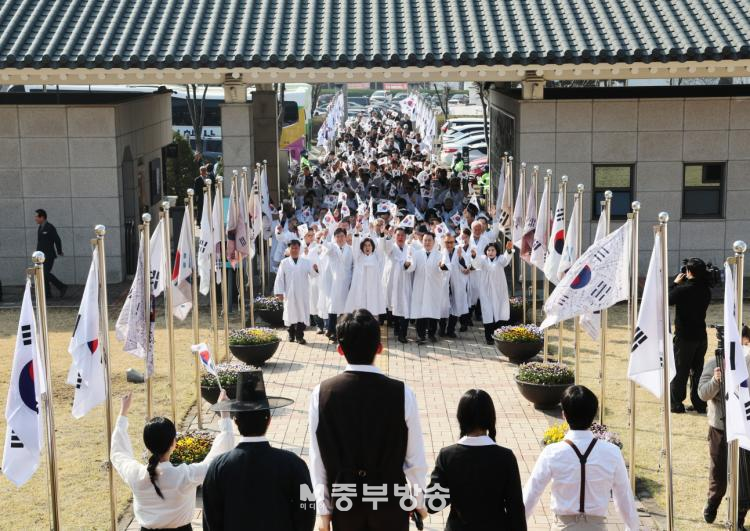 4¿ù 1ÀÏ¿¡´Â ÀÏÁ×ÃʵîÇб³¸¦ Ãâ¹ßÇØ ¿¾ ÁÖõÁÖÀç¼ÒÅÍ¿Í ÀÏÁ׸é»ç¹«¼ÒÅÍ, ÁÖõ½ÃÀåÅÍ µîÀ» Áß½ÉÀ¸·Î 1919³â Ç×ÀïÀÇ ÇöÀåÀ» µû¶ó°¡´Â ¸¸¼¼ Çà»ç°¡ À̾îÁ³´Ù. Âü°¡ÀÚµéÀº ±×³¯ÀÇ ÇÔ¼ºÀ» °¡½¿ ±íÀÌ »õ±â¸ç ¸¸¼¼»ïâÀ» ¿ÜÃÆ°í, ¼±¿µéÀÇ ¿ë±â¿Í Èñ»ýÀ» ¸ö¼Ò ´À³¢´Â ½Ã°£À» °¡Á³´Ù.