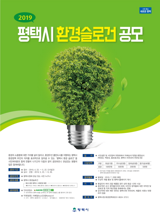 [ÆòÅÃ=¾ÈÅÂÇö ±âÀÚ] ÆòÅýÃ(½ÃÀå Á¤Àå¼±)´Â ȯ°æÀÇ Á߿伺À» ½Ã¹Î°ú ÇÔ²² ÀνÄÇϸç ȯ°æ¿ì¼± Ŭ¸°µµ½Ã¸¦ ÁöÇâÇϴ ȯ°æµµ½Ã·Î µµ¾àÇÏ´Â °è±â¸¦ ¸¸µé±â À§ÇØ ‘ÆòÅýà ȯ°æ½½·Î°Ç’À» 4¿ù 22ÀϺÎÅÍ 5¿ù 22ÀϱîÁö 1°³¿ù°£ °ø¸ðÇÑ´Ù.